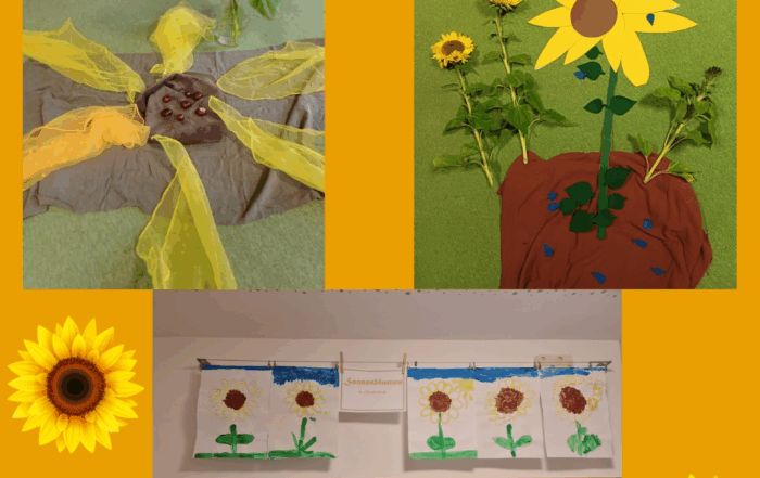 Im September und Oktober beschäftigen wir uns in allen Gruppen mit der Sonnenblume. Dazu haben wir im Morgenkreis die Sonnenblume betrachtet und Bodenbilder gelegt. Durch vielfältige Angebote wie Lieder, Geschichten, Bewegungsspiele und Klanggeschichten sowie hauswirtschaftliche Angebote wie Sonnenblumenkernbrötchen backen möchten wir mit den Kindern die Sonnenblume mit allen Sinnen erleben. In den letzten Tagen wurde schon fleißig gemalt und es sind wunderschöne Sonnenblumenbilder entstanden. Jede Gruppe setzt das Thema ganz individuell um.